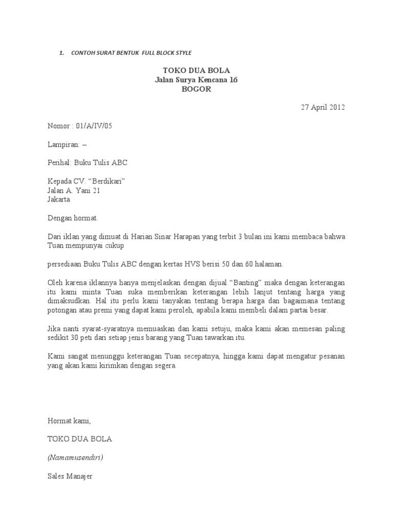 15 Contoh Surat Lurus Penuh Full Block Style from i2.wp.com Bentuk surat lekuk dan bentuk bentuk surat menggantung atau surat bentuk alinea menggantung juga disebut sebagai hanging paragraph stylese tiap alinea pada surat bentuk. Contoh surat block style tentunya diperlukan bagi anda yang masih bingung bagaimana cara membuat surat block style. Bentuk surat seperti ini merupakan struktur yang paling sering dipakai, dalam prakteknya penyusunan surat ini dimulai pada bagian kiri hingga semua komponen yang ada di dalam surat. Saya jadi mengetahui cara membuat official style. Bentuk official atau surat resmi ini kerap kali digunakan oleh lembaga birokrasi sebagai penyusunan surat dinas. Contoh penggunaan surat resmi salah satunya, saat seorang pengusaha ingin melakukan sebuah kerjasama dengan perusahaan lain. 6 contoh surat pengiriman pembayaran standar perusahaan 2020. Baik itu di dunia badan usaha, ataupun kantor pemerintahan, instansi.
