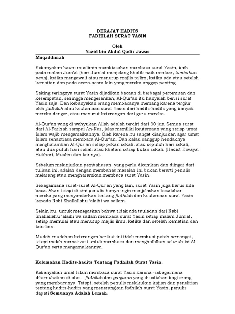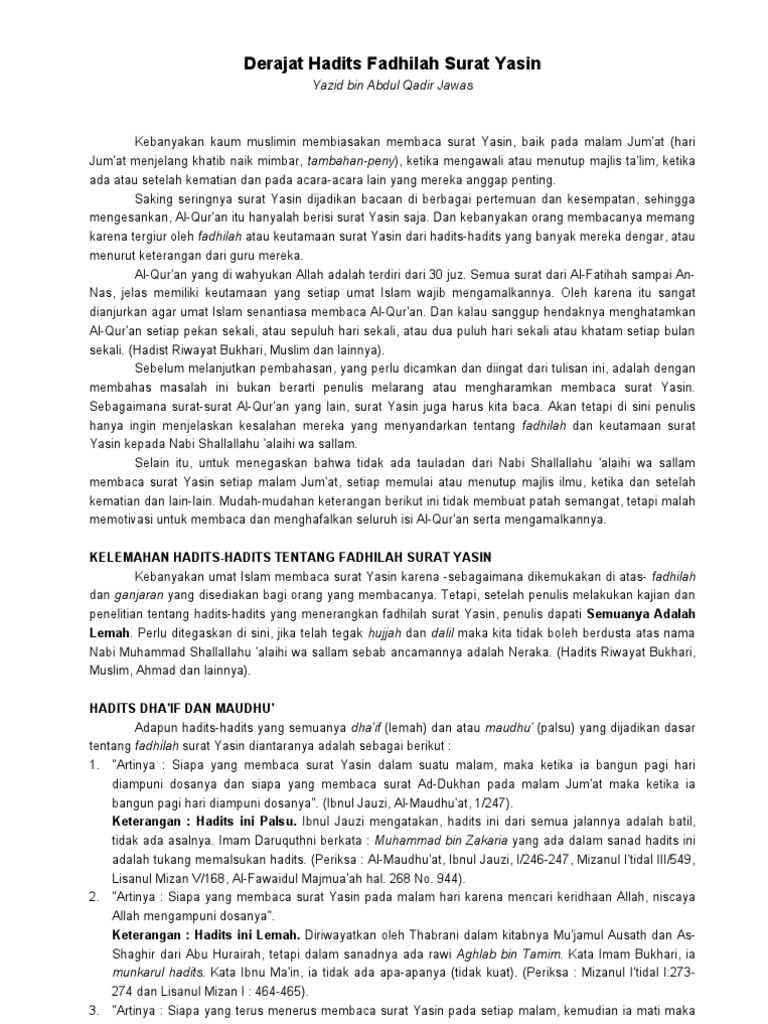 Dari 'abdullah bin 'abbas radhiyallahu 'anhum: Berikut ini bacaan surat yasin arab dan terjemah bahasa indonesia dua hadits pertama diriwayatkan imam tirmidzi namun derajatnya dhaif. Takhrij hadits keutamaan surat yasin = lemah / palsu. Benarkah ada hadis sohih tentang keutamaan surat yasin? Atsar id | arsip fawaid salafy: Maka jelaslah bahwa sesama mukmin itu adalah saudara dan keluarga yang harusnya bersatu dan mempererat tali silaturahmi. Baca surat yasin lengkap bacaan arab, latin & terjemah indonesia. Apakah membaca surat al kahfi ini harus selesai dalam sekali membaca? Walhasil, para ulama berbeda pendapat tentang status hadis ini. Allah swt lah yang mengatur rizki kita. Inilah 10 hadits tentang fadhilah dari surat yasin berserta derajatnya. Dan ini hal biasa dalam dunia ilmu. Rasulullah shallallahu 'alaihi wasallam bersabda: